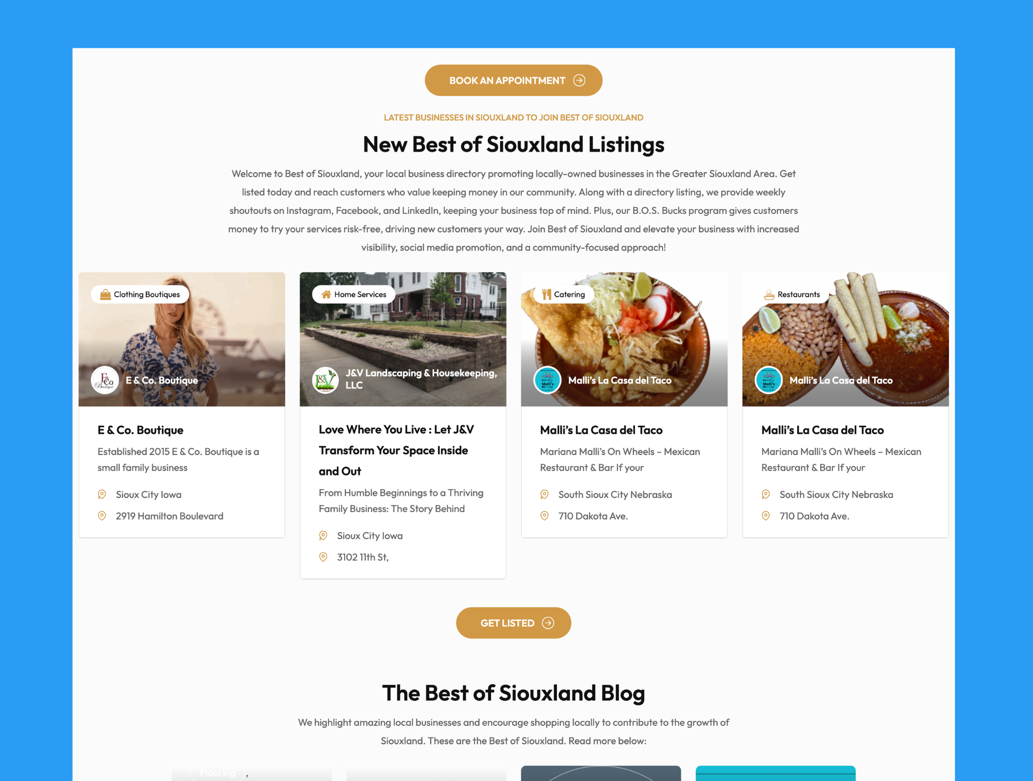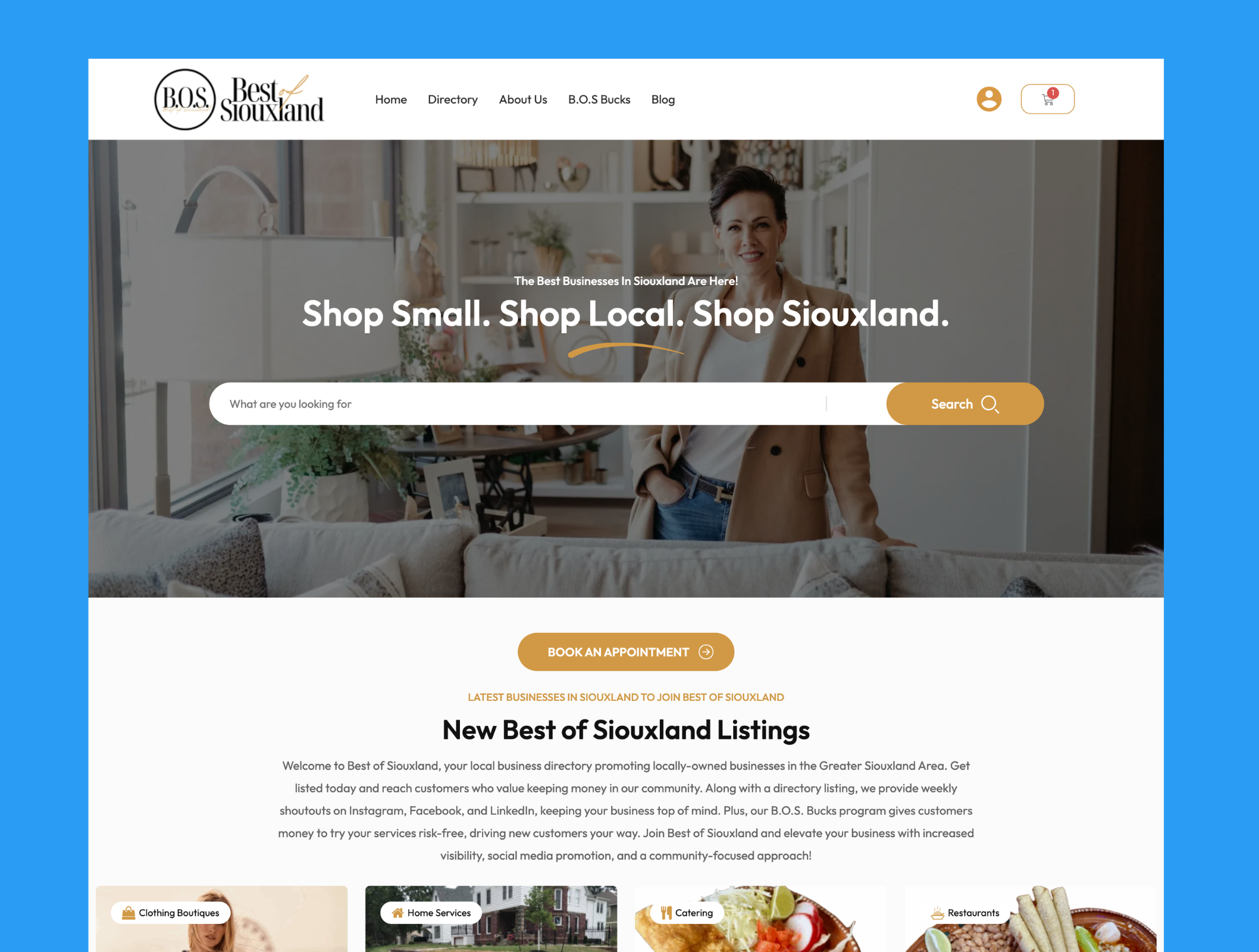 Create a local business directory platform specifically for the Siouxland community that would rank well in local search results, attract both business owners to create listings and residents to discover local services, compete with established directories like Yelp and Google Business listings, provide value to the local community through curated business information, and generate sustainable traffic through SEO rather than paid advertising — all while maintaining user-friendly navigation and professional design.