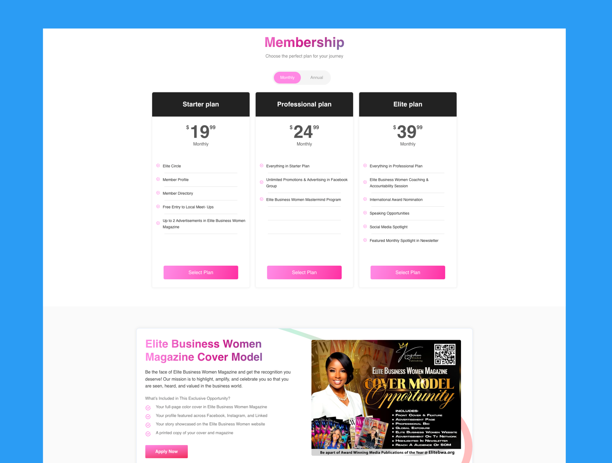 Developed comprehensive platform using WordPress, Elementor Pro, and WooCommerce. Implemented WooCommerce Subscriptions for three-tier membership system (Starter $19.99, Professional $24.99, Elite $39.99 monthly with annual options). Created separate functional areas: Shop for physical/digital products, Directory for member business listings, Magazine section for cover model applications, Events with registration system, Travel services with external booking integration, Loan services with application forms, and Donation system. Built cohesive navigation structure organizing diverse services, integrated social media (Facebook, Instagram, YouTube), and created conversion-optimized layouts for each service area.