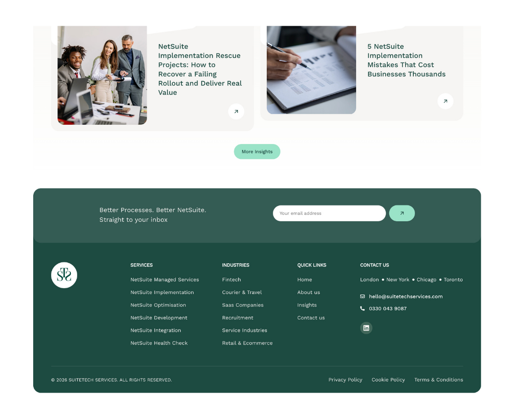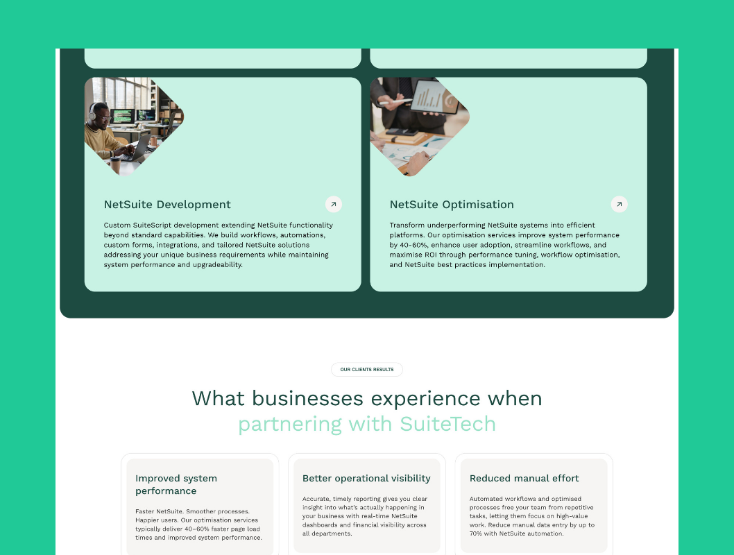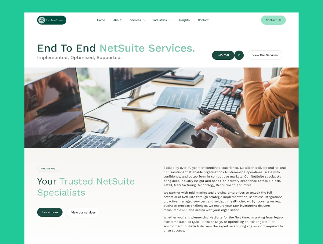 Create a professional consulting website in the competitive NetSuite services market that clearly differentiates the company’s offerings from other NetSuite partners, establishes technical credibility and expertise in ERP implementation, appeals to both technical decision-makers (IT directors) and business stakeholders (CFOs, operations managers), generates qualified leads from businesses actively searching for NetSuite help, and achieves fast load times and strong SEO rankings for NetSuite consultant and implementation keywords.